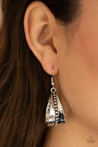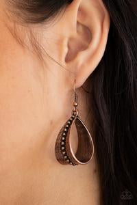 A row of antiqued studs dots the center of a hammered copper frame that curls into a rustic teardrop for a seasonal flair. Earring attaches to a standard fishhook fitting.